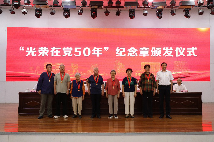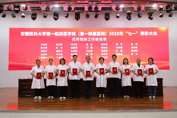6月27日下午,第一附属医院在绩溪路院区内科医技楼四楼会议中心举行庆祝中国共产党成立104周年暨“七一”表彰大会。校党委副书记、院党委书记徐朝阳出席会议,向老党员们颁发“光荣在党50年”纪念章。院党委副书记、院长孙倍成主持会议。